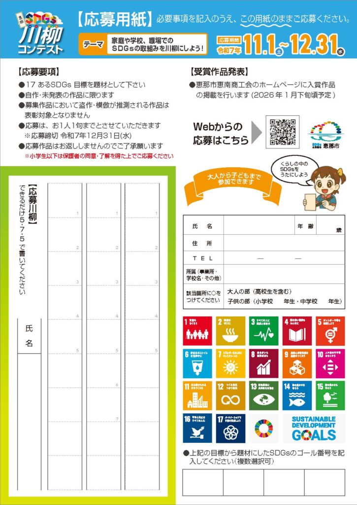 • 応募資格:恵那市民か市内の事業所に勤務または学校に在籍する方