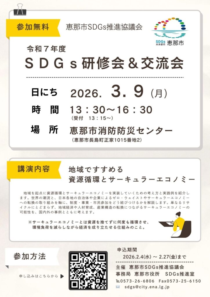 恵那市SDGs推進協議会では、SDGsをより身近に感じ、地域や仕事で活かせるヒントを見つけてもらえる『SDGs研修会&交流会 』を開催します。